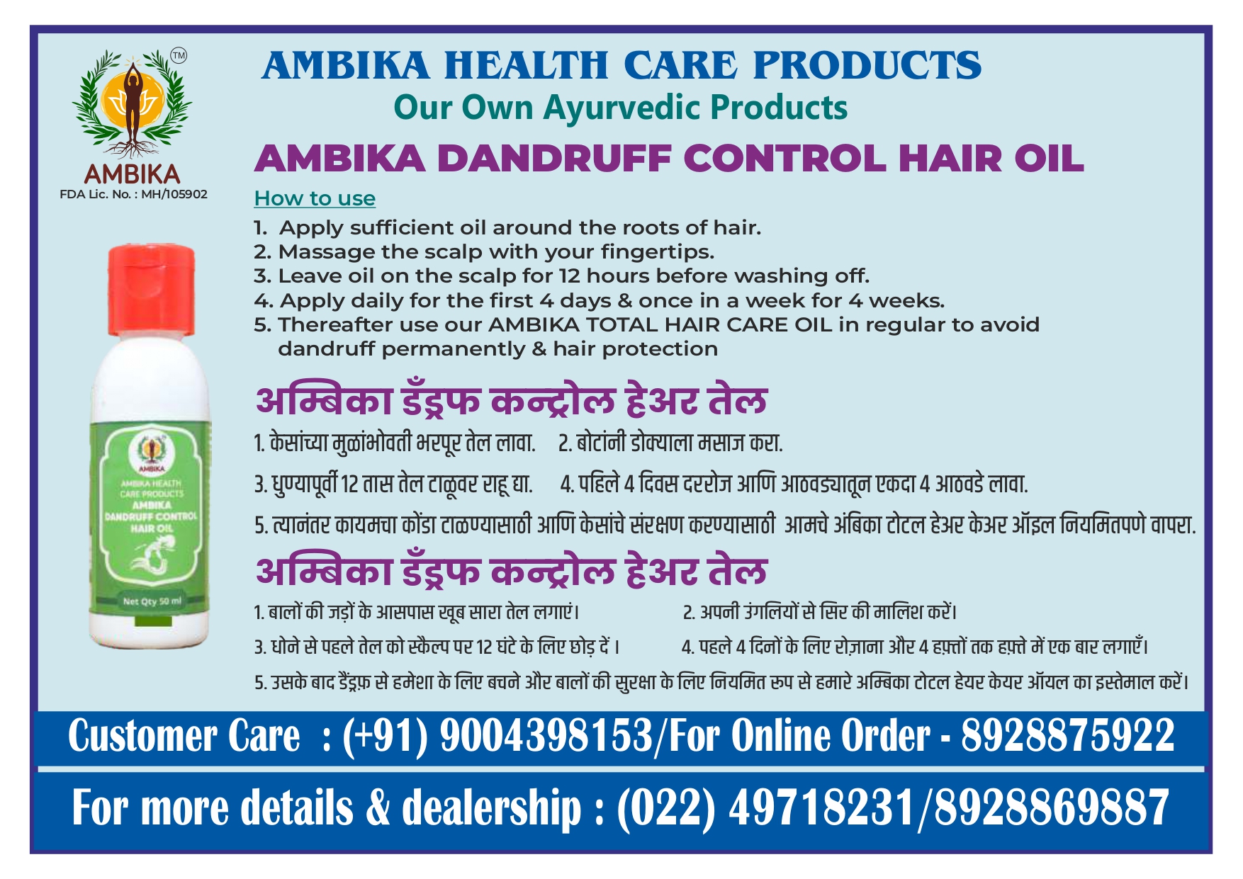 5) Thereafter use our AMBIKA TOTAL HAIR CARE OIL in regular to avoid dandruff permanently & hair protection
